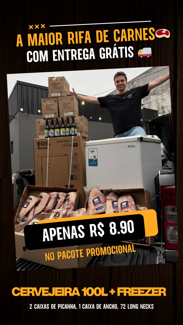 🏆 Prêmio: 1 Cervejeira Eos Blackglass 100l Recheada Com 72 LongNecks de Lohn Pilsen + 1 Freezer Eos (seminovo) Cheio com 1 Caixa de Ancho Frigoraça (16kgs) e 02 Caixa de Picanha Mataboi (28 kgs)