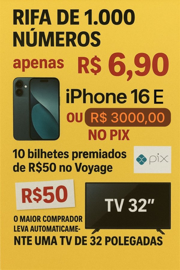 Rifa Rápida rolando com iPhone 16 ou R$3.000 no PIX pro campeão! 🔥